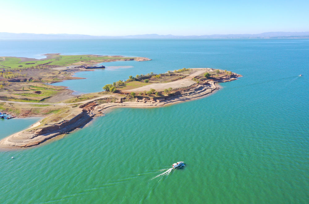 2024年11月29日,在淅川縣丹江口水庫宋崗碼頭附近,庫區(qū)綜合執(zhí)法大隊工作人員開船巡護(hù)(無人機(jī)照片)。新華社記者 郝源 攝