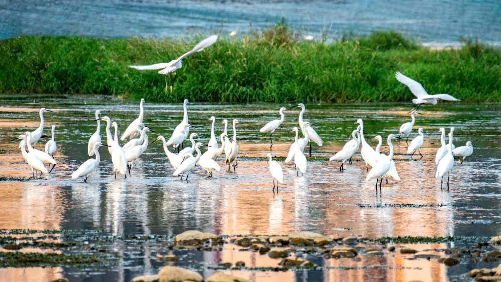 2023年8月29日,一群白鷺在淅川縣丹江濕地內(nèi)嬉戲。新華社發(fā)(張建林 攝)