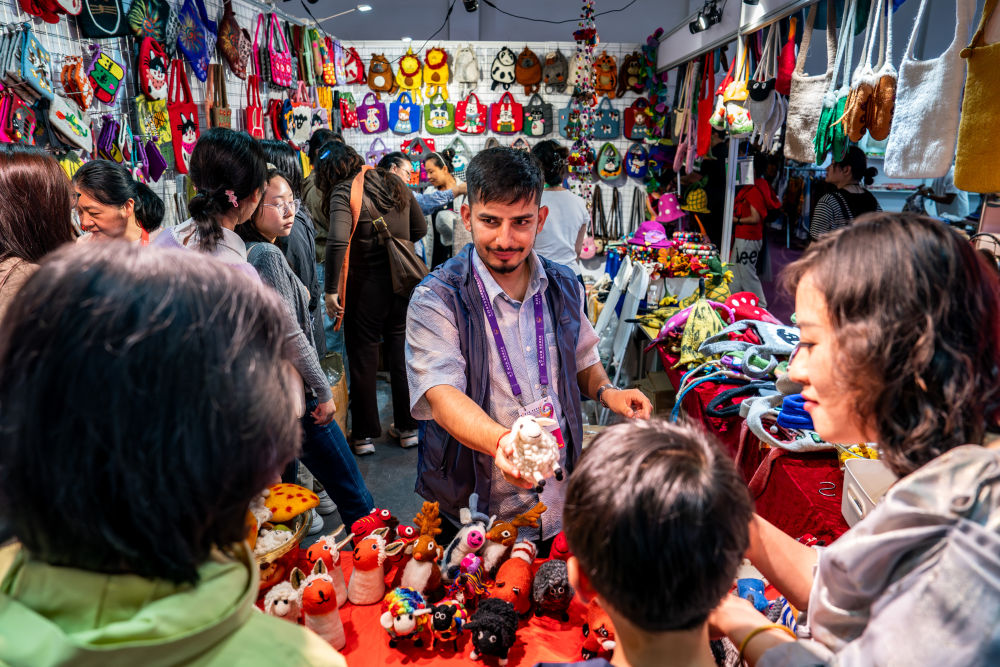 6月21日,第9屆中國(guó)—南亞博覽會(huì)南亞館尼泊爾展區(qū)的參展商向觀眾推介特色商品。