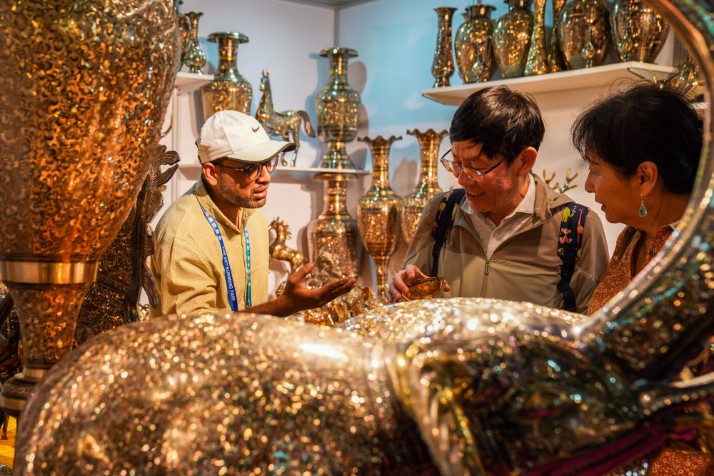 6月20日,顧客在南亞館巴基斯坦展區(qū)選購(gòu)銅制工藝品。