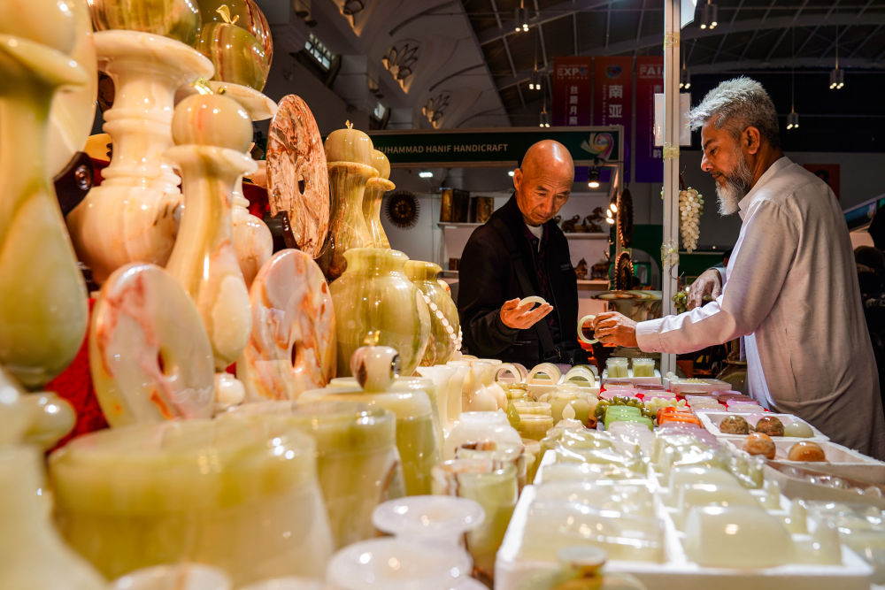 6月20日,顧客在南亞館巴基斯坦展區(qū)選購(gòu)玉石工藝品。