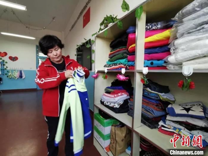 吾吉整理捐贈的衣物。 張曉敏 攝