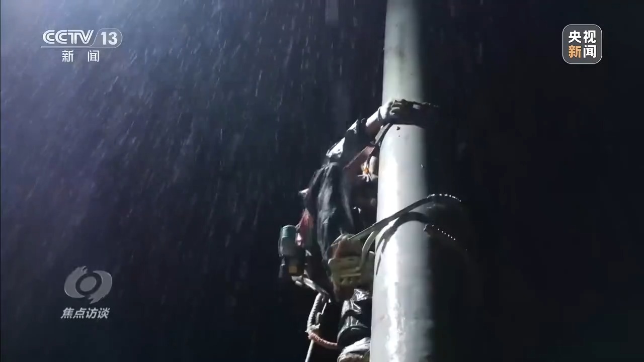 運線、接線、試驗……雨夜中,隊員們分工協(xié)作,借助車燈和探照燈的光亮,將一根1100米長、近4噸重的電纜拉過大橋,沿著公路邊緣一路拉到變壓器旁。大雨中作業(yè),雨水很快就打濕了他們的衣服。為了搶修進度,高空作業(yè)人員在電桿上一待就是好幾個小時。