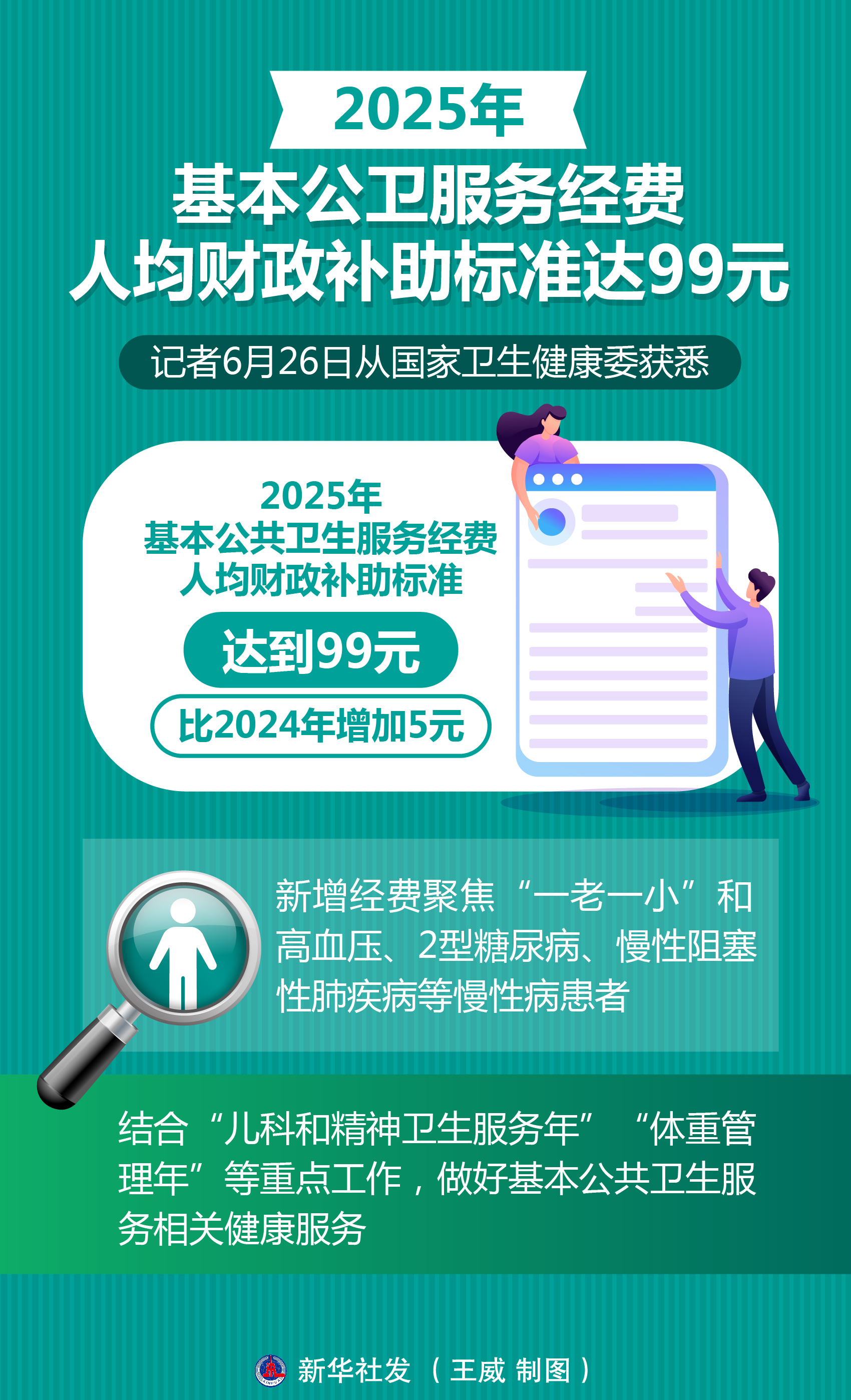 記者26日從國家衛(wèi)生健康委獲悉,2025年基本公共衛(wèi)生服務(wù)經(jīng)費(fèi)人均財(cái)政補(bǔ)助標(biāo)準(zhǔn)達(dá)到99元,比上年增加5元。