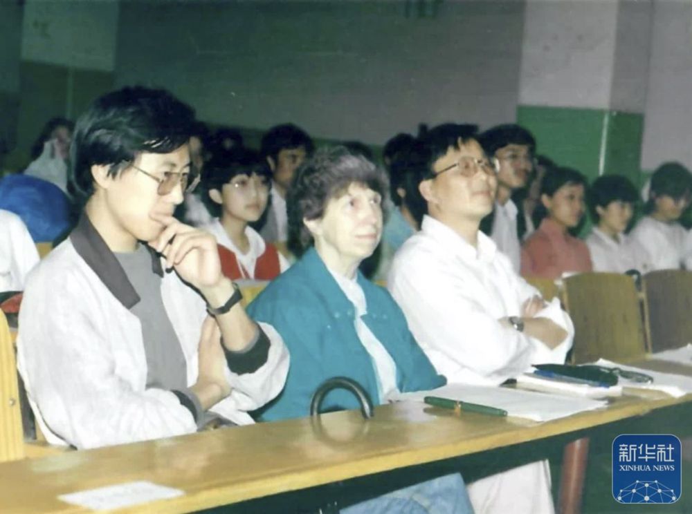 20世紀(jì)80年代,白麗詩(shī)(前中)在上海外國(guó)語大學(xué)任教時(shí)的工作照(翻拍照片)。