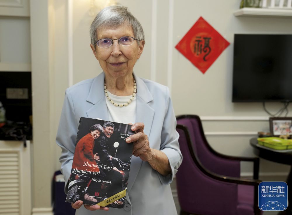 2025年6月13日,白麗詩(shī)展示自己與丈夫王正文合著的英文版回憶錄《上海男孩,上海女孩》。