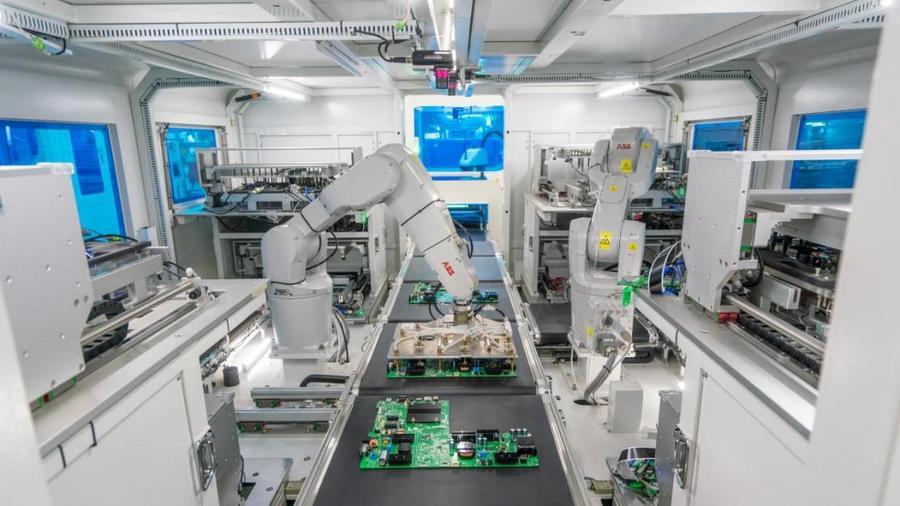 現(xiàn)代化的生產(chǎn)車間里,大部分工作已被機(jī)械臂和機(jī)器人“接管”;車間一側(cè)的智慧大屏上,實(shí)時(shí)顯示溫濕度、靜電、隱患巡查等關(guān)鍵數(shù)據(jù)。
