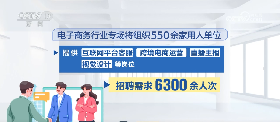 電子商務(wù)行業(yè)專場將組織550余家用人單位,提供互聯(lián)網(wǎng)平臺客服、跨境電商運(yùn)營、直播主播、視覺設(shè)計(jì)等崗位,招聘需求6300余人次。