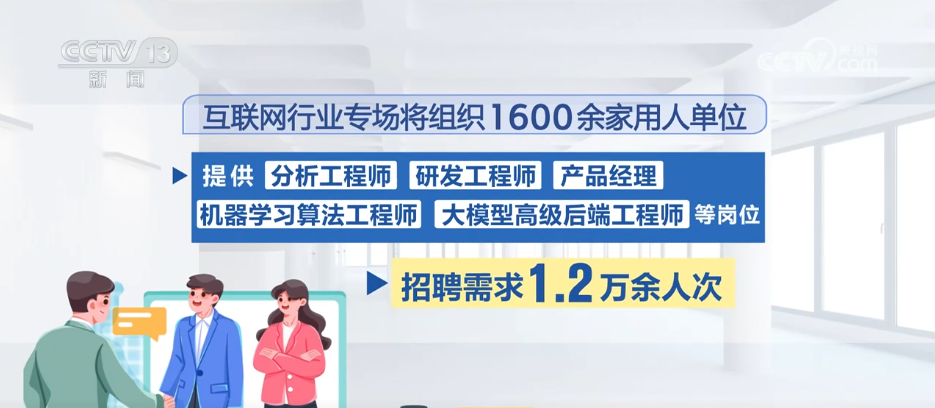 互聯(lián)網(wǎng)行業(yè)專場將組織1600余家用人單位,提供分析工程師、研發(fā)工程師、產(chǎn)品經(jīng)理、機(jī)器學(xué)習(xí)算法工程師、大模型高級后端工程師等崗位,招聘需求1.2萬余人次。