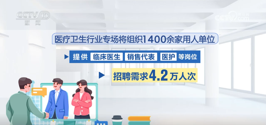 醫(yī)療衛(wèi)生行業(yè)專場將組織1400余家用人單位,提供臨床醫(yī)生、銷售代表、醫(yī)護(hù)等崗位,招聘需求4.2萬人次。