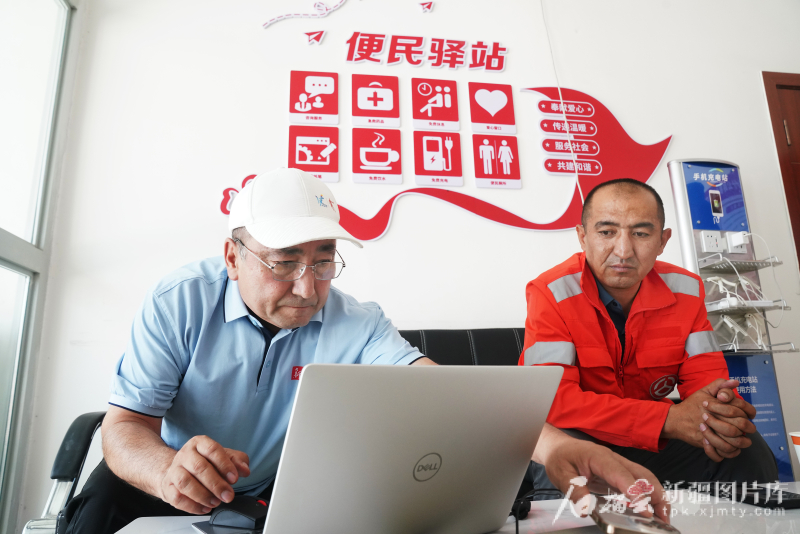 7月1日,在喀什公路事業(yè)發(fā)展中心疏附養(yǎng)護(hù)所蓋孜養(yǎng)護(hù)站,記者馬晉軒(左)和王永飛利用午餐時(shí)間準(zhǔn)備稿件。