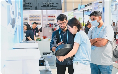 4月16日,客商在廣交會上了解掃地機(jī)器人產(chǎn)品。新華社記者 盧漢欣攝