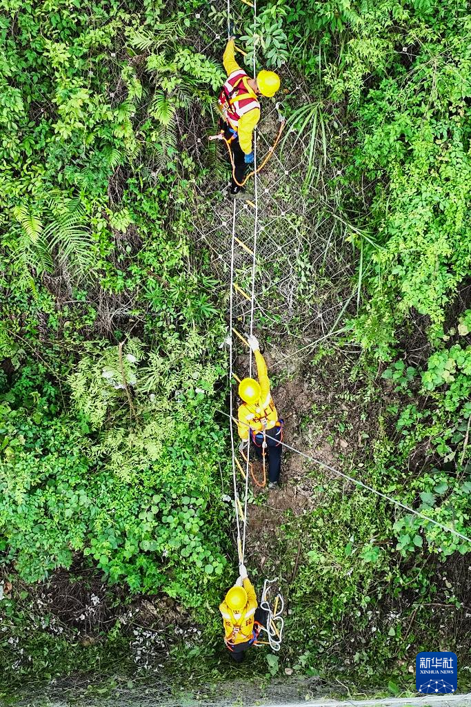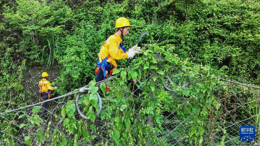 橋隧工人清除被動網(wǎng)上的藤蔓和雜草(7月15日攝,無人機照片)。