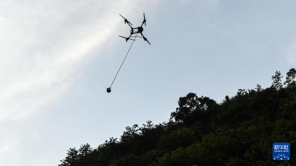 橋隧工人遙控無人機給隧道山體上的施工點運送混凝土(7月15日攝)。