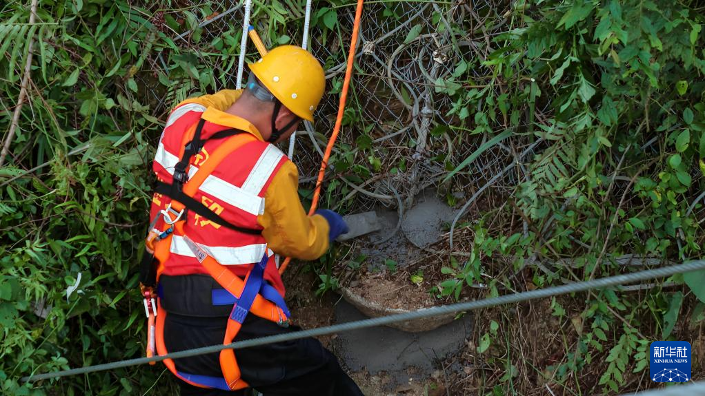 橋隧工人巡查隧道頂部的被動網(wǎng)(7月15日攝,無人機照片)。