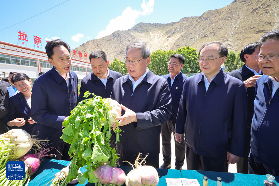 7月18日至19日,中共中央政治局常委、國務(wù)院總理李強在西藏調(diào)研。這是7月19日在拉薩,李強來到曲水才納國家現(xiàn)代農(nóng)業(yè)示范區(qū),聽取自治區(qū)農(nóng)牧業(yè)產(chǎn)業(yè)發(fā)展、高原生物研究所建設(shè)等介紹,觀看示范區(qū)自產(chǎn)果蔬、高原特色食飲品、民族手工藝品等展示。新華社記者 劉彬 攝