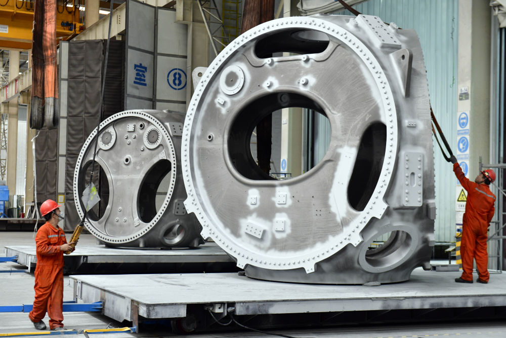 在位于山東省濱州市惠民縣的山東國創(chuàng)精密機械有限公司,工作人員在對風(fēng)電輪轂進(jìn)行噴涂作業(yè)。新華社記者郭緒雷 攝