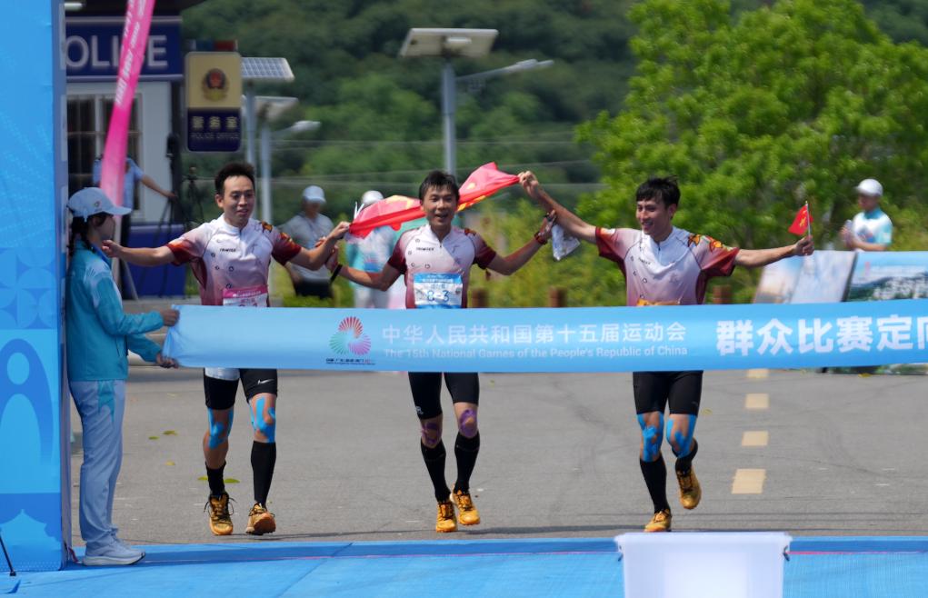5月8日,廣東隊選手李卓業(yè)(中)、唐建達(左)、唐瀟在男子定向接力賽中沖向終點。當(dāng)日,第十五屆全國運動會群眾賽事活動定向接力賽決賽在廣東省茂名市高州根子鎮(zhèn)舉行。新華社記者 黃國保 攝