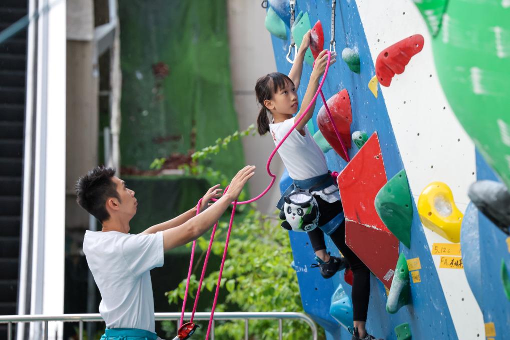 圖為在深圳福田區(qū)呢度有家攀巖館,來自中國香港的9歲女孩何芊芊(右)在爸爸何善揮的保護下開始難度攀巖訓(xùn)練(6月17日攝)。新華社記者 梁旭 攝