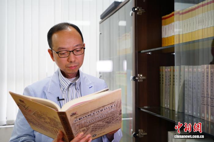 7月24日,澳門理工大學(xué)人文及社會(huì)科學(xué)學(xué)院院長(zhǎng)、澳門口述歷史協(xié)會(huì)會(huì)長(zhǎng)林發(fā)欽翻閱《抗戰(zhàn)時(shí)期澳門日志(上)》。 中新社記者 鄭嘉偉 攝