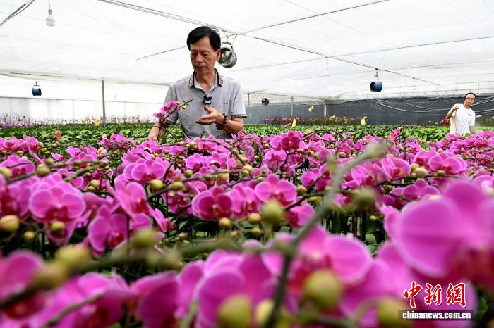 7月16日,臺胞王耀宗在位于福建漳州市南靖縣的天農(nóng)蘭花園里查看蝴蝶蘭長勢。 中新網(wǎng)記者 呂明 攝