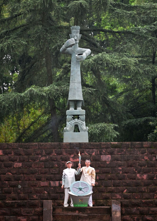 2025年7月26日,三星堆博物館代表肖先進(jìn)(左)、金沙遺址博物館代表朱章義在火種采集儀式上展示火種。當(dāng)日,第十二屆世界運(yùn)動(dòng)會火炬?zhèn)鬟f活動(dòng)在四川舉行。