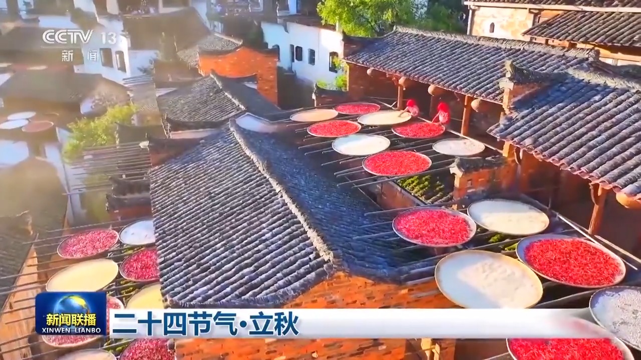 立秋至,曬秋忙。人們利用房前屋后晾曬農(nóng)作物,色彩斑斕,既是風俗,也是風景。