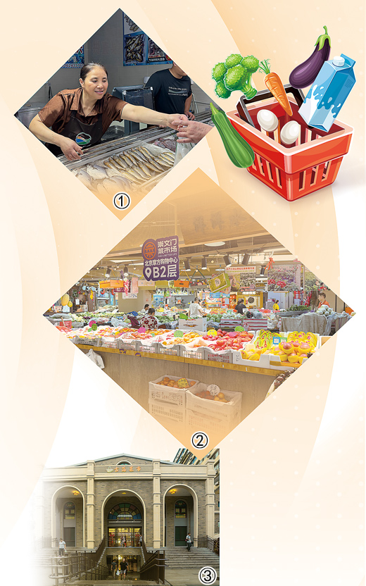 圖②:位于合景·摩方購物中心內(nèi)的新崇文門菜市場,貨架上各類水果、蔬菜琳瑯滿目。本報(bào)記者 李君強(qiáng)攝