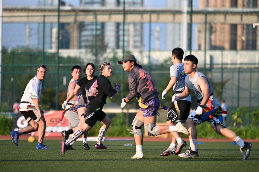 7月27日,在成都工作生活的運動愛好者吳慶文(左四)在腰旗橄欖球比賽中。新華社記者 胥冰潔 攝