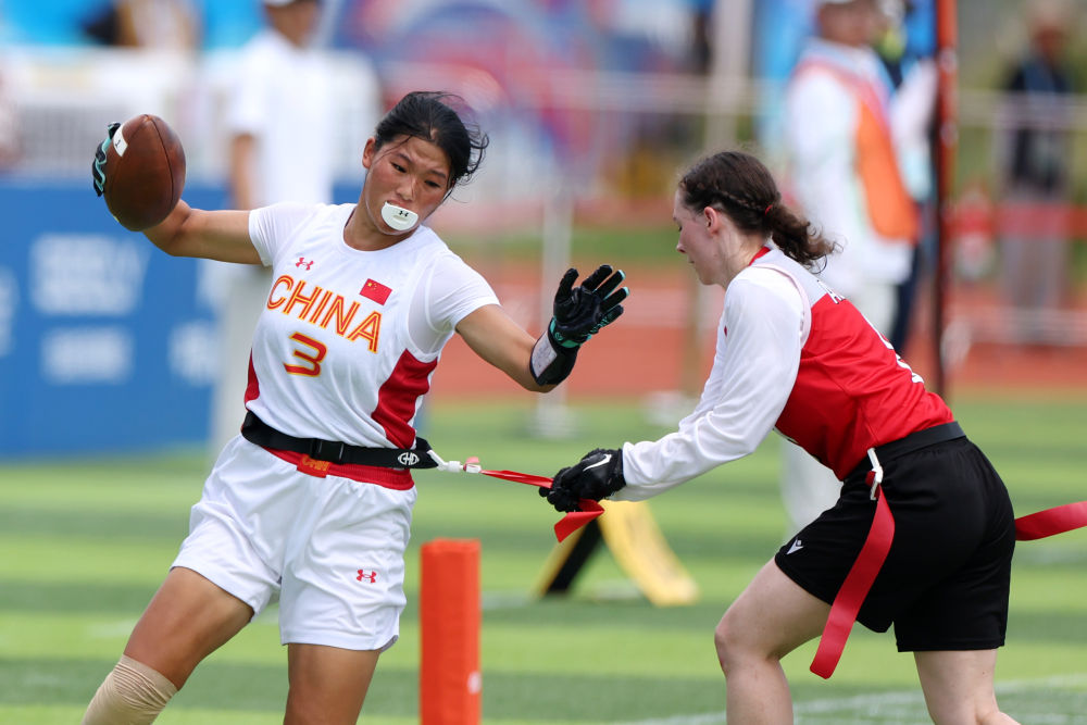 14日,腰旗橄欖球項目開賽。賽場上的激烈比拼與觀眾席上的“雄起”吶喊讓體育場“燃”起來。
