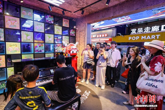 8月7日,游客在貴陽市青云市集彈共享鋼琴被圍觀。中新社記者 瞿宏倫 攝