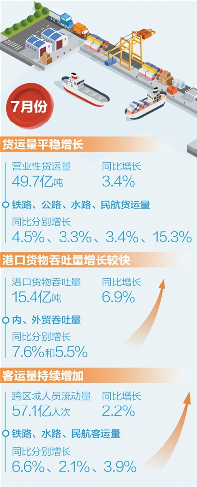 貨運量保持平穩(wěn)增長。7月份,完成營業(yè)性貨運量49.7億噸,同比增長3.4%,增速較上月回升0.5個百分點。分方式看,鐵路、公路、水路、民航貨運量同比分別增長4.5%、3.3%、3.4%、15.3%。1至7月,完成營業(yè)性貨運量330億噸,同比增長3.8%。
