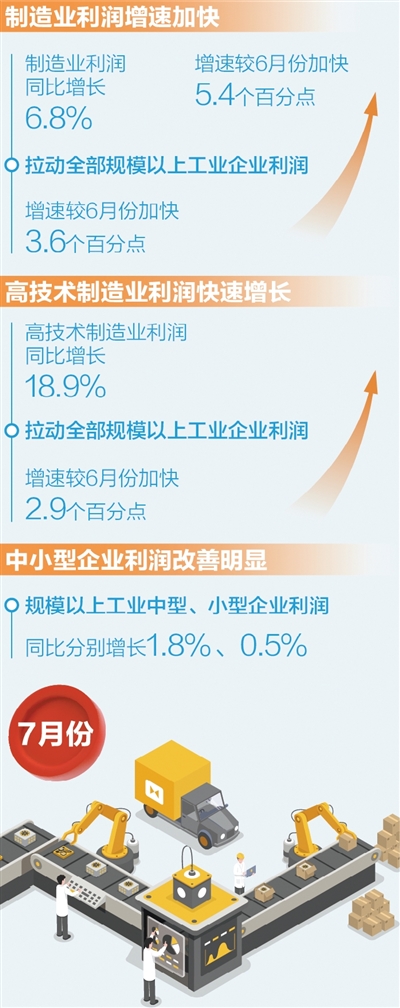 高技術制造業(yè)利潤快速增長,引領作用明顯。7月份,高技術制造業(yè)利潤由6月份下降0.9%轉為增長18.9%,拉動全部規(guī)模以上工業(yè)企業(yè)利潤增速較6月份加快2.9個百分點,引領作用明顯。其中,航空航天器及設備制造行業(yè)利潤增長40.9%,生物藥品制造、化學藥品制劑制造等行業(yè)利潤分別增長36.3%、6.9%。