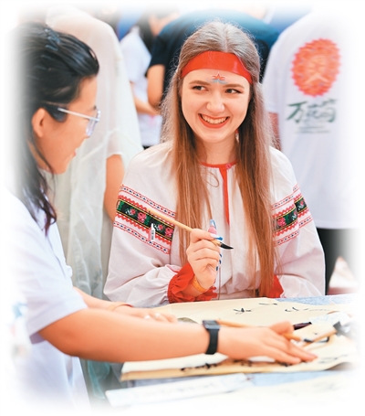 8月6日,“上合之約·絲路津彩”上合國(guó)家青年學(xué)生“萬花筒”文化市集在天津舉行。圖為青年學(xué)生體驗(yàn)書法。