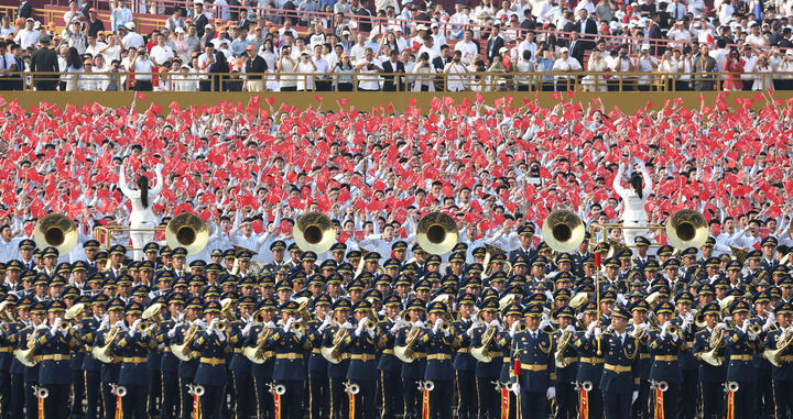 ↑9月3日,紀(jì)念中國(guó)人民抗日戰(zhàn)爭(zhēng)暨世界反法西斯戰(zhàn)爭(zhēng)勝利80周年大會(huì)在北京隆重舉行。這是中國(guó)人民解放軍聯(lián)合軍樂(lè)團(tuán)和合唱團(tuán)。新華社記者 劉衛(wèi)兵 攝