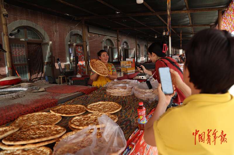 9月9日,新疆巴州尉犁縣興平鎮(zhèn)達(dá)西村,店主向顧客展示新疆馕。毗鄰尉犁縣城的達(dá)西村打造了商業(yè)街、民宿風(fēng)情一條街,現(xiàn)有36家風(fēng)情園、9家民宿,旅游業(yè)成為當(dāng)?shù)卮迕裥碌脑鍪拯c(diǎn)。中青報·中青網(wǎng)記者 王鑫昕/攝