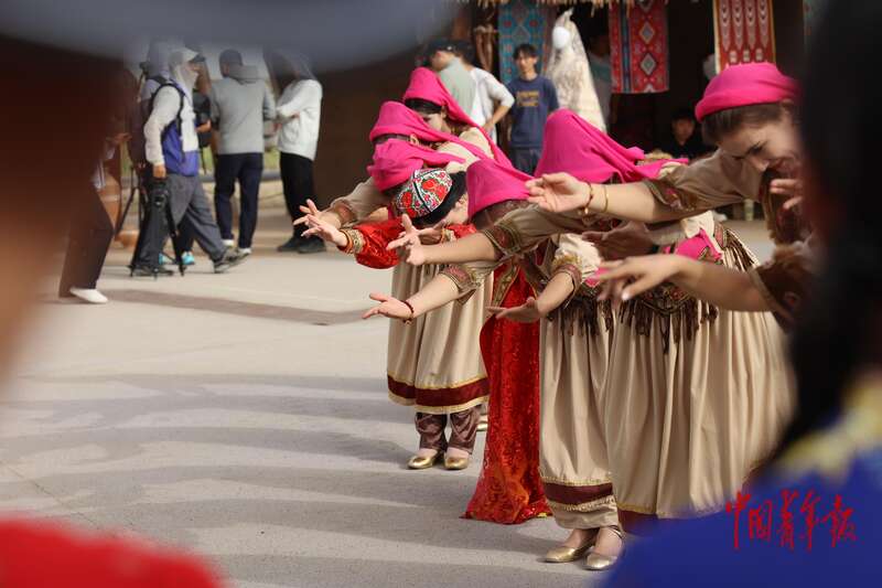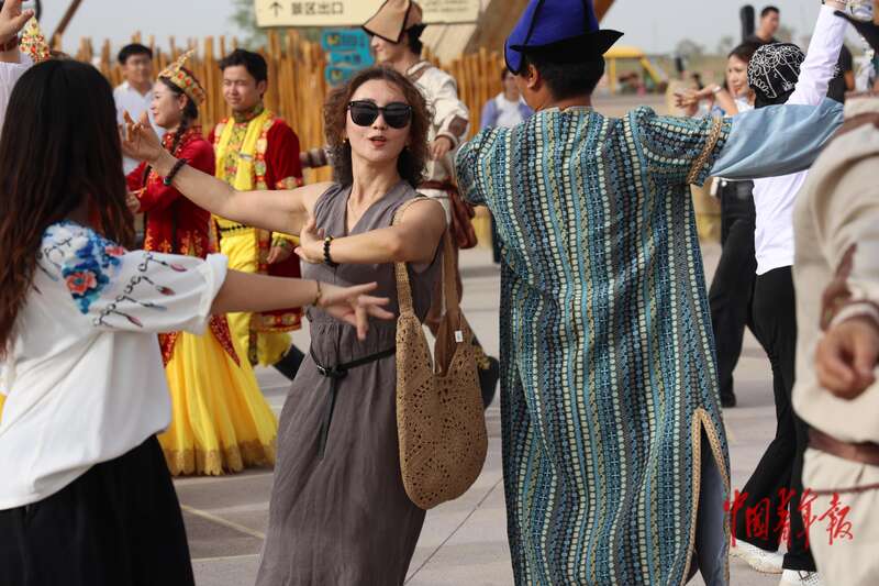 9月9日,新疆巴州尉犁縣羅布人村寨景區(qū),游客和當(dāng)?shù)匮輪T一起跳舞。羅布人村寨集沙漠、河流、湖泊、森林、草原等自然景觀與獨(dú)特的羅布淖爾民俗文化景觀于一體,是外地游客體驗新疆風(fēng)情的重要一站,深受人們喜愛。中青報·中青網(wǎng)記者 王鑫昕/攝