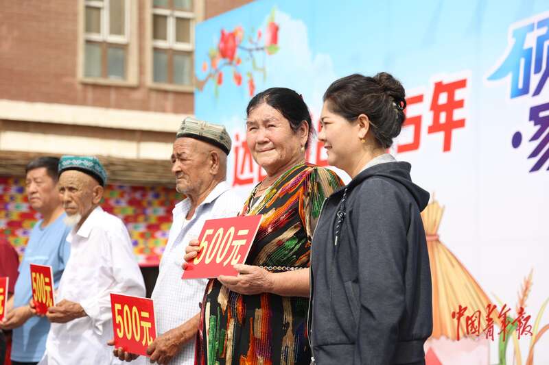 9月9日,新疆巴州尉犁縣興平鎮(zhèn)達(dá)西村,一場慶豐收活動上,達(dá)西村黨委書記夏提古麗·熱合曼(右一)代表村集體向該村長者發(fā)放慰問金。通過棉花種植、文化旅游等,2024年達(dá)西村集體收入達(dá)230.55萬元。中青報·中青網(wǎng)記者 王鑫昕/攝