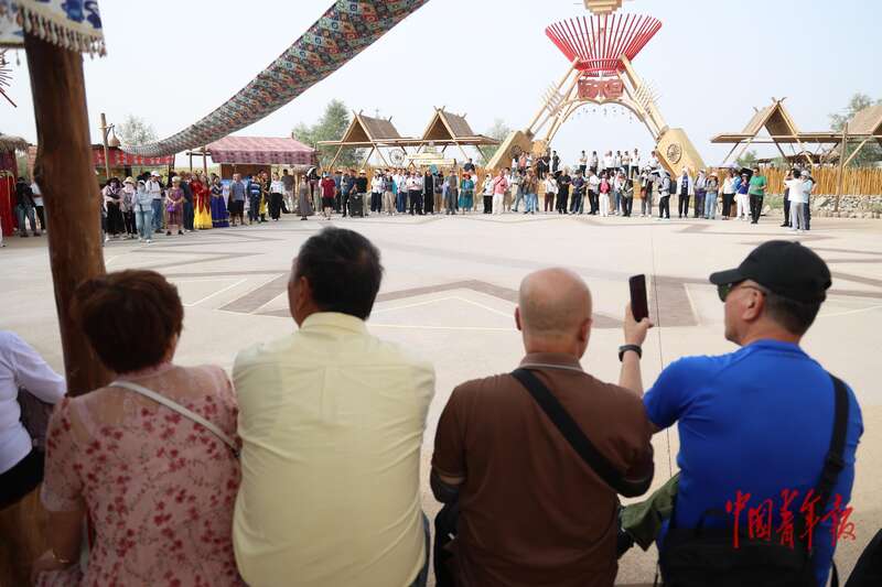 9月9日,新疆巴州尉犁縣羅布人村寨景區(qū),游客等待演員登場演出。中青報·中青網(wǎng)記者 王鑫昕/攝