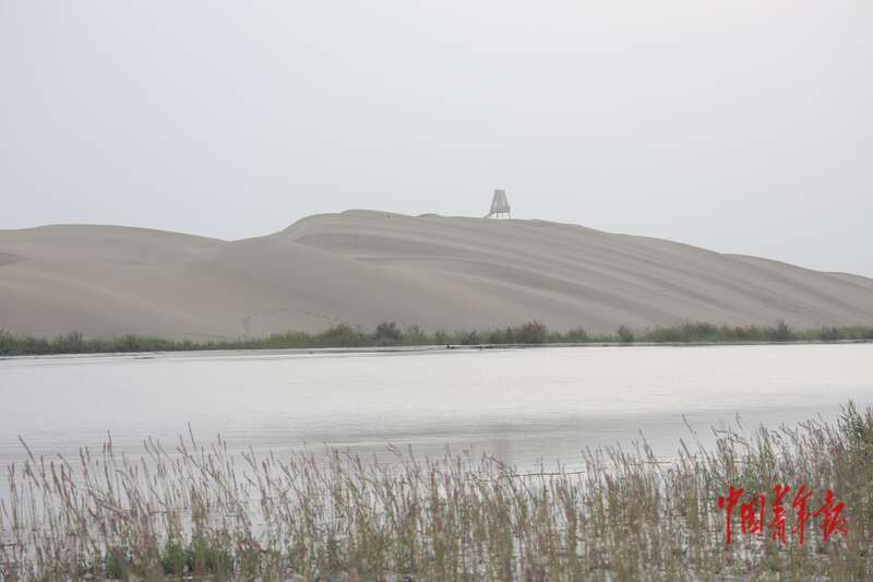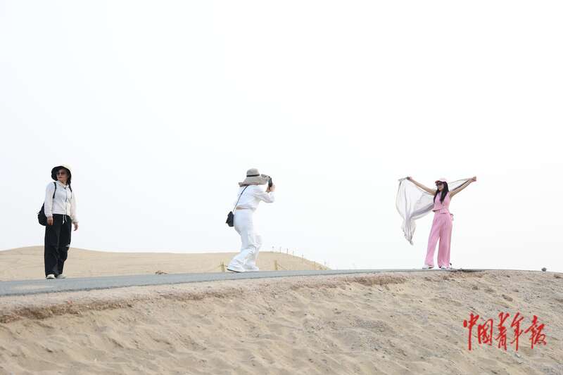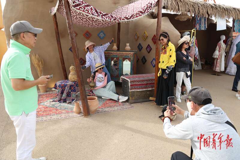 9月9日,新疆巴州尉犁縣羅布人村寨景區(qū),游客以廣袤的塔克拉瑪干沙漠為背景拍照留念。中青報·中青網(wǎng)記者 王鑫昕/攝