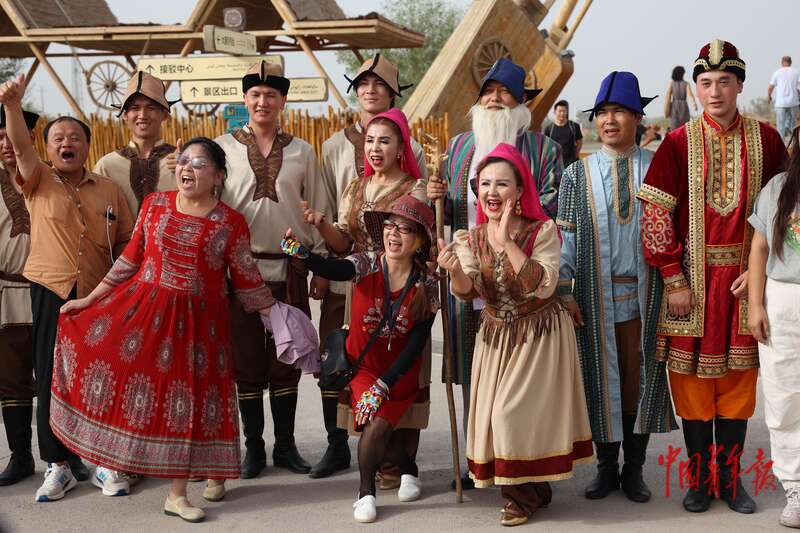 9月9日,新疆巴州尉犁縣羅布人村寨景區(qū),一場演出結(jié)束后,游客和當(dāng)?shù)匮輪T合影留念。中青報·中青網(wǎng)記者 王鑫昕/攝