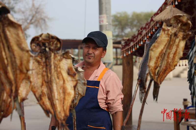 9月9日,新疆巴州尉犁縣羅布人村寨景區(qū),一位店主在現(xiàn)烤草魚。在尉犁縣,羅布人村寨在旅游扶貧、旅游惠民、旅游興縣等方面發(fā)揮著龍頭作用,景區(qū)從業(yè)人員80%以上是當(dāng)?shù)剞r(nóng)牧民。中青報·中青網(wǎng)記者 王鑫昕/攝