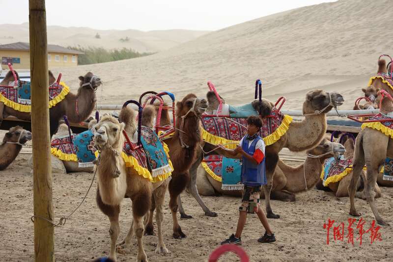 9月9日,新疆巴州尉犁縣羅布人村寨景區(qū),游客騎駱駝觀光。中青報·中青網(wǎng)記者 王鑫昕/攝