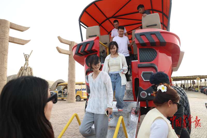 9月9日,新疆巴州尉犁縣羅布人村寨景區(qū),游客們走下被稱為“大腳怪”的沙漠觀光車。中青報·中青網(wǎng)記者 王鑫昕/攝