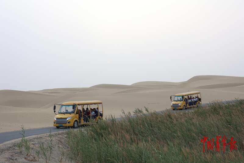 9月9日,新疆巴州尉犁縣羅布人村寨景區(qū),觀光車行進(jìn)在塔克拉瑪干沙漠中。中青報·中青網(wǎng)記者 王鑫昕/攝