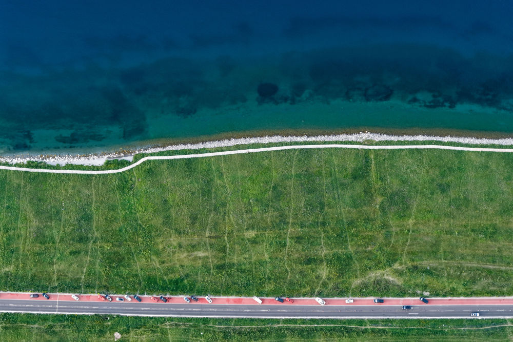 ↑ 游客駕車行駛在賽里木湖景區(qū)(無(wú)人機(jī)照片,7月8日攝)。