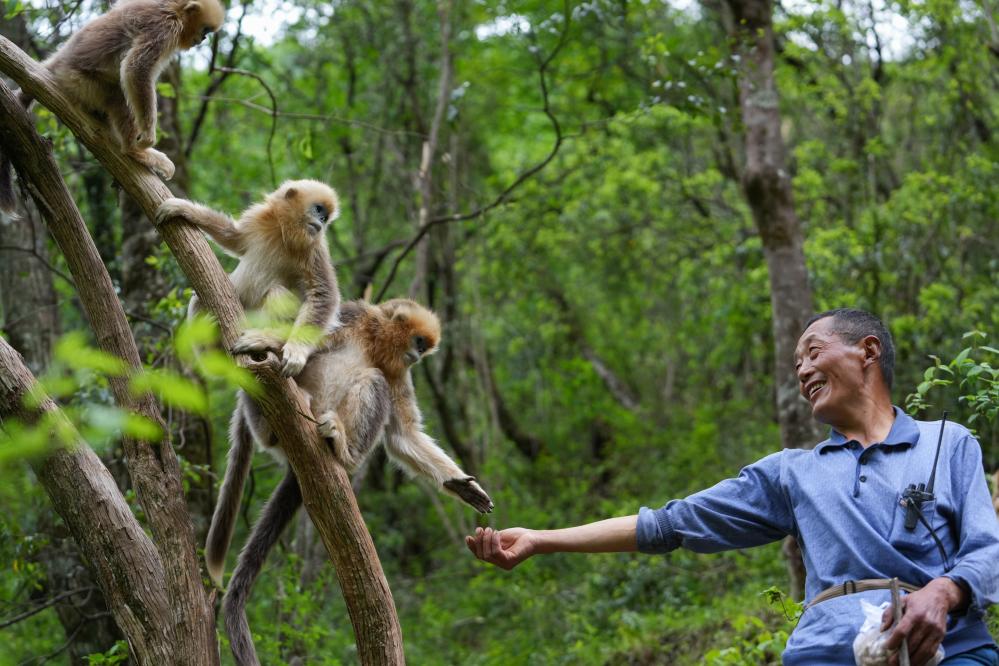 5月21日,巡護員徐庭友在巡護路上遇到幾只小川金絲猴,喂金絲猴吃花生。