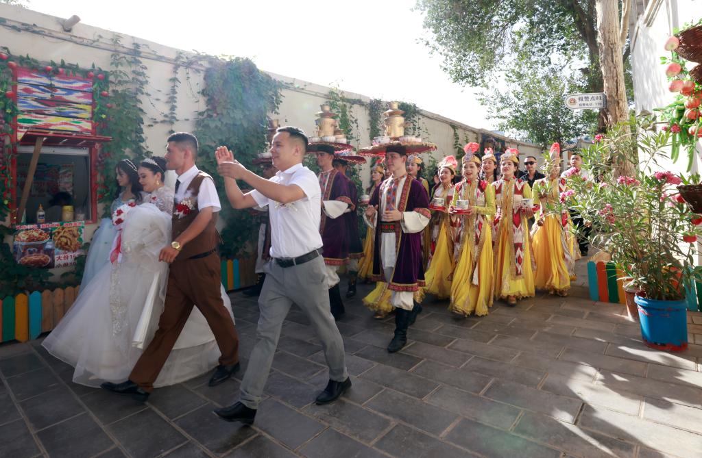 7月22日,在新疆庫車市的龜茲小巷,表演薩瑪瓦爾舞的演員參與當(dāng)?shù)氐囊粓龌槎Y活動(dòng)。新華社記者 王菲 攝