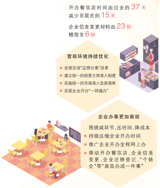 原先需要手動(dòng)填寫的信息變?yōu)橄到y(tǒng)智能生成,申請(qǐng)人只需勾選和核對(duì);表單的流轉(zhuǎn)從線下紙質(zhì)層層傳遞,變?yōu)橄到y(tǒng)上動(dòng)動(dòng)手指就可辦理……餐飲“一件事”改革后,營業(yè)執(zhí)照實(shí)現(xiàn)了上午提交、下午出證,食品經(jīng)營許可證辦理時(shí)間也從20個(gè)工作日縮短到三四天。