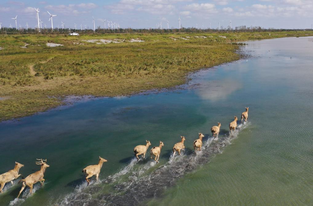 2024年12月21日在大豐野鹿蕩拍攝的麋鹿(無人機照片)。新華社記者 季春鵬 攝